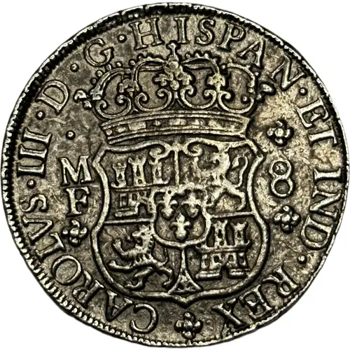 (Translation: Carlos 3rg by the grace of God King of Spain and the Indies MF 8 Reales)
