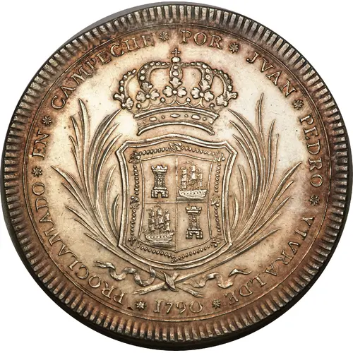 | Obverse lettering | PROCLAMADO * EN * CAMPECHE * POR * JVAN * PEDRO * YTURALDE *1790* (Translation: Proclaimed in Campeche by Juan Pedro Iturralde 1790) |