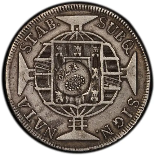 | Obverse description | Countermark, crowned F. 7. o, over coat of arms of Portugal on armillary sphere over cross. |