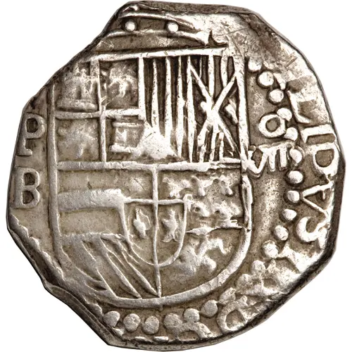 Obverse description Coat representing the lands of the catholic kings and a crown on the top. Mint mark P (Potosí), assayer`s mark M (Juan Sánchez Mejía) - Coin value: 8. Round line of dots, separating lettering.