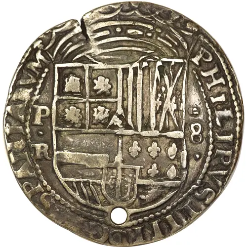 Artistry: This coin exemplifies the "cob" coinage style, prioritizing rapid production over artistic refinement. No specific engravers are identified. The design is functional and symbolic: the Pillars of Hercules, often flanking waves, symbolize Spain's global reach. The reverse features a large cross potent, representing the Catholic monarchy. The obverse bears the crowned Habsburg shield. Due to crude striking, designs are frequently off-center, and complete legends are rarely preserved.