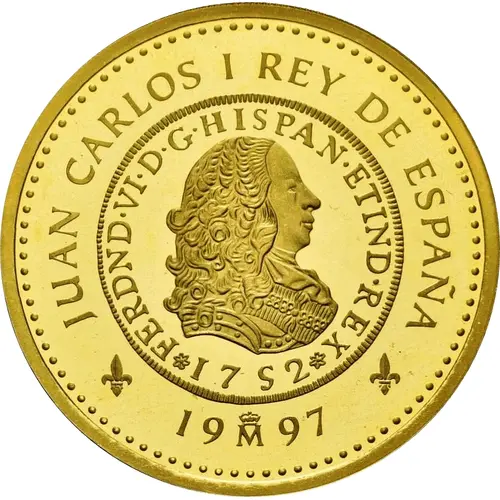 | Obverse lettering | JUAN CARLOS I REY DE ESPAÑA FERDND • VI • D • G • HISPAN• ETIND • REX 1752 19M97 (Translation: Juan Carlos I King of Spain Fernando VI by the Grace of God, King of Spain and the Indies 1752 1997 Madrid) |
