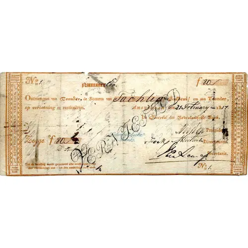 | Obverse lettering | NEDERLANDSCHE BANK. Ontvangen van Toonder de Somma van Tachtig Guldens / om aan Toonder, op vertooning te restituëren. Amsterdam, den 21 February 1817. Nederlandsche-Bank President - Directeur - Secretaris Legge f 80. (Translation: Bank of Netherlands. Received from Bearer the Somma of a Eighty Guilders, to restimese to Bearer upon presentation. Amsterdam, the February 21, 1817. Bank of Netherlands. President - Director - Secretary 80) |