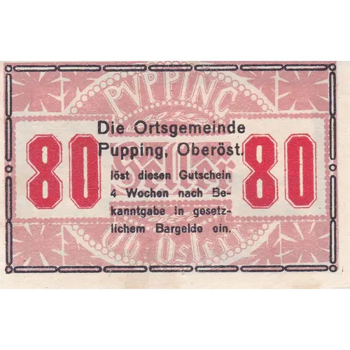 Die Ortsgemeinde Pupping, Oberöst. löst diesen Gutschein 4 Wochen nach Bekanntgabe in gesetzlichem Bargeld ein. (Translation: The municipality of Pupping, Upper Austria redeems this voucher in legal cash 4 weeks after notification.) |