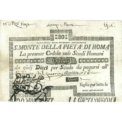 | Legenda del dritto | 80 PRIMO AGOSTO MILLE SETTECENTO NOVANTASETTE S. M. DI PIETA DI ROMA La presente Cedola vaglia Scudi Romani Ottanta da giulj dieci per Scudo da pagarsi all` Esibitore. |