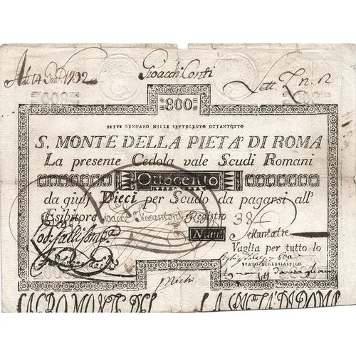 | Vorderseitenlegende | 800 SETTE GENNARO MILLE SETTECENTO OTTANTOTTO S. M. DI PIETA DI ROMA La presente Cedola vaglia Scudi Romani Ottocento da giulj dieci per Scudo da pagarsi all` Esibitore. |
