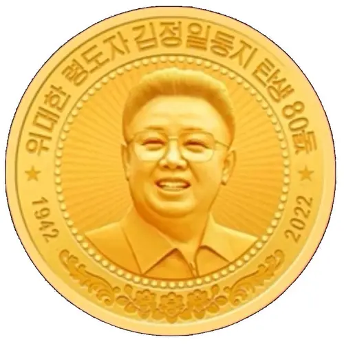| Obverse description | Portrait of Kim Jong Il surrounded by 80 dots with the lettering `80th Birth Anniversary of the Great Leader Kim Jong Il`. at the bottom is decorated with magnolias and the years `1942` and `2022` |