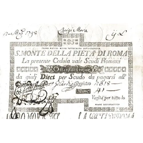 | Legenda awersu | 85 PRIMO MAGGIO MILLE SETTECENTO NOVANTASETTE S. M. DI PIETA DI ROMA La presente Cedola vaglia Scudi Romani Ottantacinque da giulj dieci per Scudo da pagarsi all` Esibitore. |