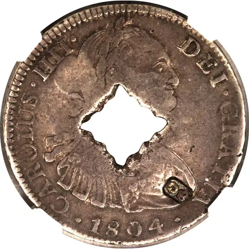 Ön yüz açıklaması Countermark Crowned G on obverse and reverse of Mexico 8 Reales, KM#109 with crenated square hole. Original obverse: bust facing right.