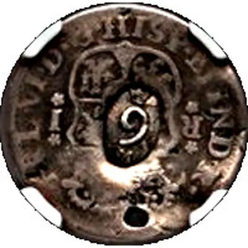 | توضیحات پشت سکه | VTRA QUE VNUM LM JD Type 2: Charles III, Spanish Réal, Madrid. Obverse countermarked - 9 raised within a elliptical indent, circa 2.48g. Type 3: Spanish-American Réal. One side countermarked c / 9 raised within an elliptical indent, circa 2.63g |