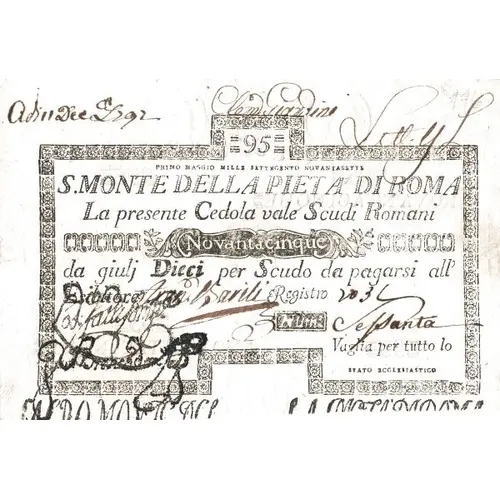| Legenda del dritto | 95 PRIMO MAGGIO MILLE SETTECENTO NOVANTASETTE S. M. DI PIETA DI ROMA La presente Cedola vaglia Scudi Romani Novantacinque da giulj dieci per Scudo da pagarsi all` Esibitore. |