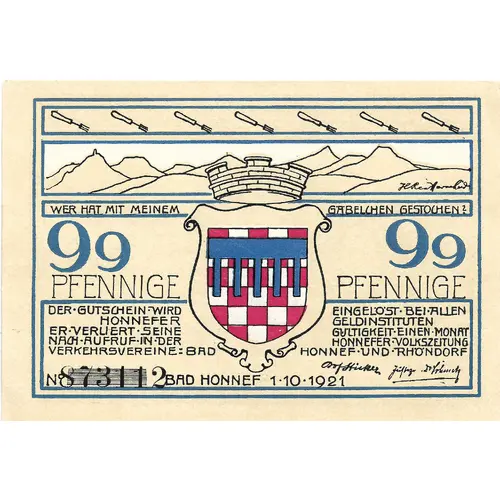 WER HAT MIT MEINEM GÄBELCHEN GESTOCHEN? 50 PFENNIGE 50 PFENNIGE DER GUTSCHEIN WIRD EINGELÖST BEI ALLEN HONNEFER GELDINSTITUTEN ER VERLIERT SEINE GÜLTIGKEIT EINEN MONAT NACH AUFRUF IN DER HONNEFER VOLKSZEITUNG VERKEHRSVEREINE: BAD HONNEF UND RHÖNDORF No. 873112 BAD HONNEF 1.10.1921 |