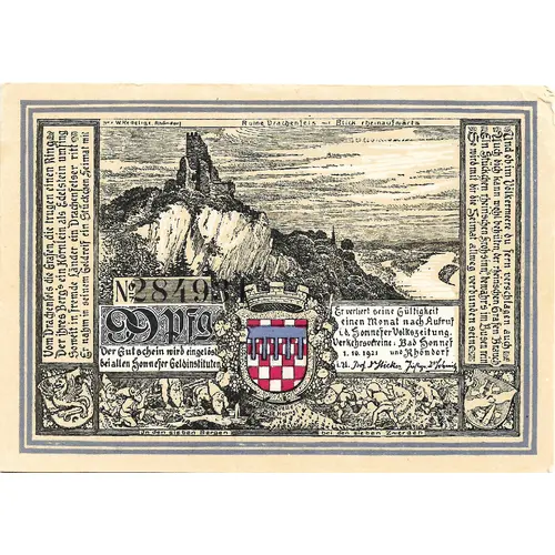 gez. W. Redeligx Rhöndorf Ruine Drachenfels mit Blick rheinaufwärts No. 284931 99 Pfg. Der Gutschein wird eingelost bei allen Honnefer Geldinstituten Er verliert siene Gültigkeit einen Monat nach Aufruf i d. Honnefer Volkszeitung. Verkehrsvereine. Bad Honnef und Rhöndorf 1.10.1921 Vom Drachenfels die Grafen, die trugen einen Ring Der ihres Berg`s ein Körnlein als Edelstein umfing Soweit in fremde Länder ein Drachenfelser ritt Er nahm in seinem Goldreif ein Stückchen Heimat mit Und ob im Völkermeere du fern verschlagen auch Auch dich kann wohl behüten, der rheinschen Grafen Brauch Ein Stückchen rheinschen Frohsinn`s bewahr`s im Busen rein So wird mit dir die Heimat allweg verbunden sein In den sieben Bergen bei den sieben Zwergen |