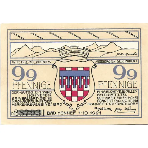 WER HAT MIT MEINEM MESSERCHEN GESCHNITTEN? 50 PFENNIGE 50 PFENNIGE DER GUTSCHEIN WIRD EINGELÖST BEI ALLEN HONNEFER GELDINSTITUTEN ER VERLIERT SEINE GÜLTIGKEIT EINEN MONAT NACH AUFRUF IN DER HONNEFER VOLKSZEITUNG VERKEHRSVEREINE: BAD HONNEF UND RHÖNDORF No. 287931 BAD HONNEF 1.10.1921 |