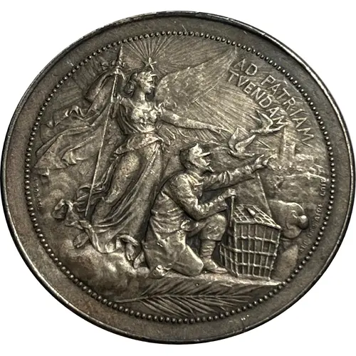 (fr) Listel perlé. Victoire ailée, tenant un drapeau, sous une étoile radiée pointe du doigt des colombes qui s’envolent. |