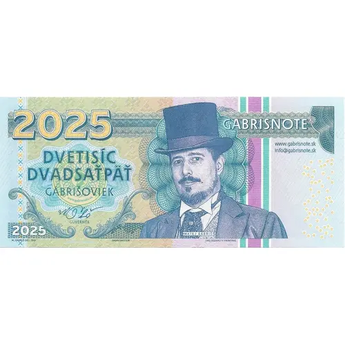 Obverse lettering 2025 GABRISNOTE ® DVETISÍC DVADSAŤPÄŤ GÁBRIŠOVIEK www.gabrisnote.sk [email protected] GUVERNER 2025 MATEJ GABRIŠ M. GABRIS DEL .DIG. GABRISNOTE DAS SECURITY PRINTING