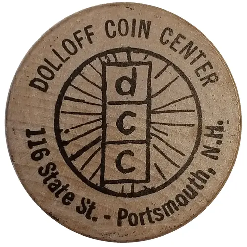 | 表面の説明 | Dcc in vertical blocks, rays behind, all enclosed in circle. DOLLOFF COIN CENTER around rim at top, 116 State St. - Portsmouth, N.H. around rim at bottom. Black ink. |
