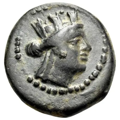 | Opis awersu | Turreted head of Kybele/Tyche to right. |