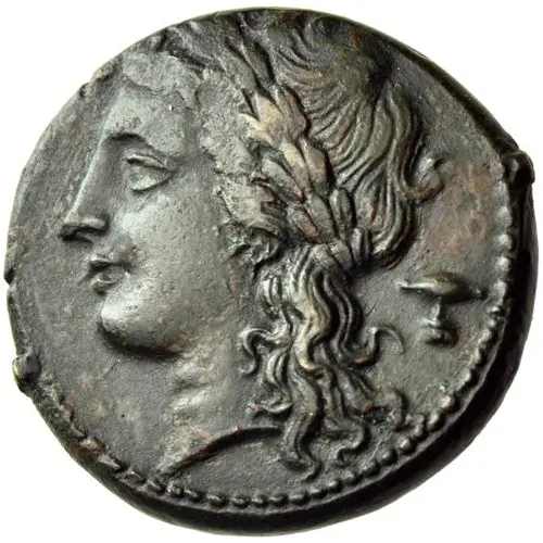 | Aversbeschreibung | Laureate head of Apollo to left; in the field to right, plectrum. |