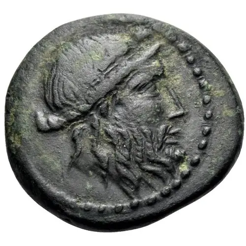 Описание аверса Bearded and ivy-wreathed head of Priapus, right.