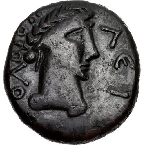 Popis líce Head of Apollo wearing laurel wreath right; OΛBIOΠO-ΛЄI around.