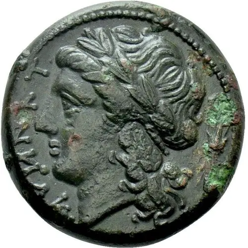 توضیحات روی سکه Laureate head of Apollo left; behind symbol or Greek letter.