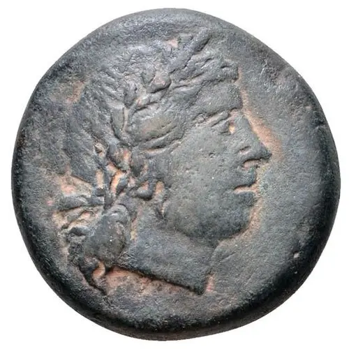 | Descripción del anverso | Laureate head of Apollo to right. |