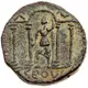 Reverse description Front view of shrine with four columns with arcuated lintel between small pediment on each wing, within which Tyche standing facing turreted, head left, holding small bust and spear and placing foot on pro (?).