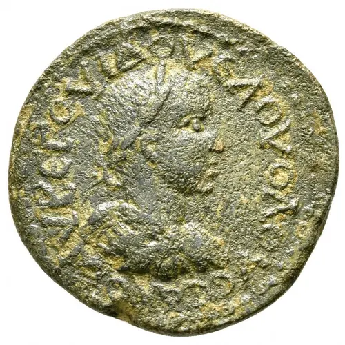 ΑΥ ΚE Γ ΟΥΙΔ ΟΥEΛ ΟΥΟΛΟΥCCΑΝΟΙ (Translation: AY(-τοκράτωρ) K(-αίσαρ) Γ(-άιος) ΟΥΙ(-βιος) ΟΥEΛ(-δυμνιανος) ΟΥΟΛΟΥCC(-ι-)ΑΝΟ(-ς). `Emperor Caesar Gaius Vibius Veldumnianus Volusianus`.) |