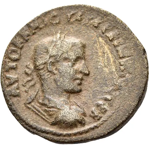 | 背面描述 | Temple with arched pediment and four columns enclosing draped, veiled and turreted Tyche seated facing, with ram leaping right above her; below, river god swimming right. |