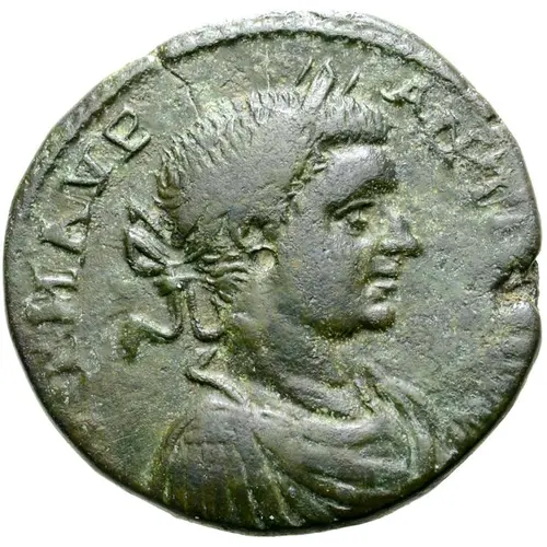 AYT M AYP ANTΩNINOC (Translation: (Αυτοκράτωρ Μάρκου Αυρήλιου Αντωνίνος) `Emperor Marcus Aurelius Antoninos`.) |