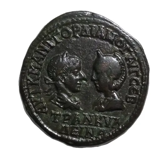 | Obverse description | Confronted busts of Gordian III to the right, laureate, draped, cuirassed, and of Tranquilline diademed and draped on the left, seen from three quarters in front. |