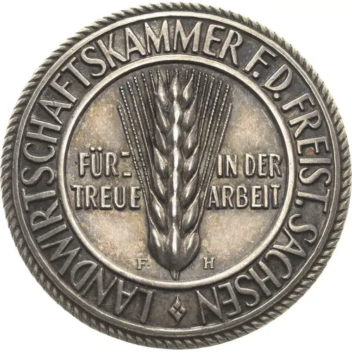 | Obverse lettering | LANDWIRTSCHAFTSKAMMER F. D. FREIST. SACHSEN FÜR= IN DER TREUE ARBEIT F H |