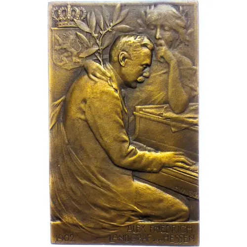 | Opis awersu | The blind Landgrave playing the piano, behind him a female figure who is leaning on the piano with her left hand and has her right hand placed around the Landgrave`s neck. She is holding a laurel branch in her hand and the crowned Hesse coat of arms in the field at the top left. |