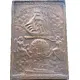 Half-length figure in uniform with buildings surrounding, two torches to upper sides. |