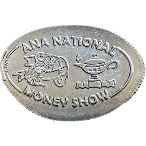 | Descrição do anverso | Emblems of TEC (The Elongated collectors; owl with ribbon at left) and the ANA (American Numismatic Association; oil lantern at right) with text above and below |
