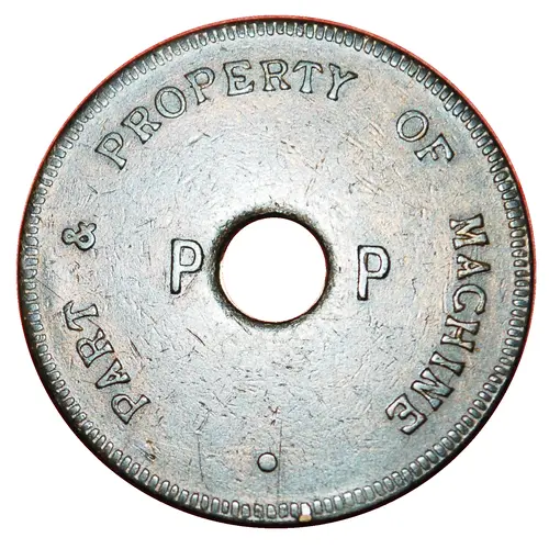 Circular legend around. Letters P and P on the sides of the central hole. All letters in sans-serif font. Beaded with three diamonds at the bottom. |