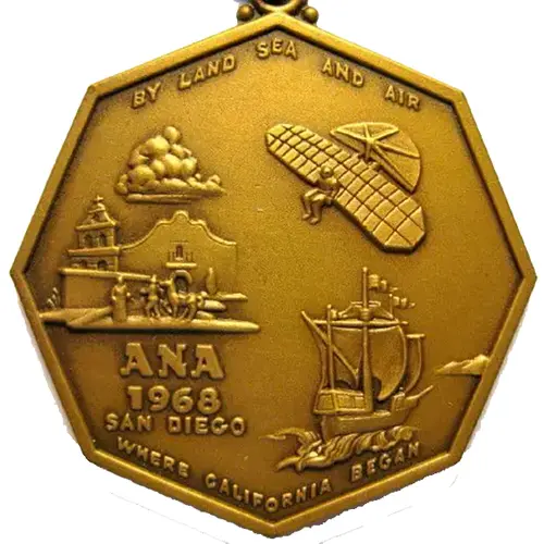 | Obverse lettering | By Land Sea And Air ANA 1968 San Diego Where California Began |