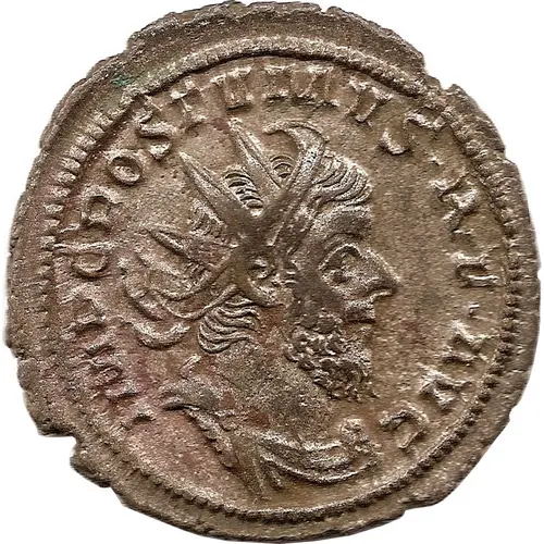 | توضیحات روی سکه | Radiated bust of Posthumus on the right, draped and cuirassed (paludamentum visible), seen from three-quarters forward (style 3 portrait). |