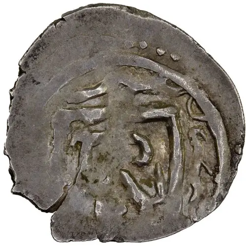 Possibly a sunni kalima or a different inscription within a square, surrounded by an illegible legend that is encircled. The circle is surrounded by small pellets. |