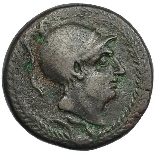 Beschrijving voorzijde Male head facing right, wearing helmet. Laurel wreath around.