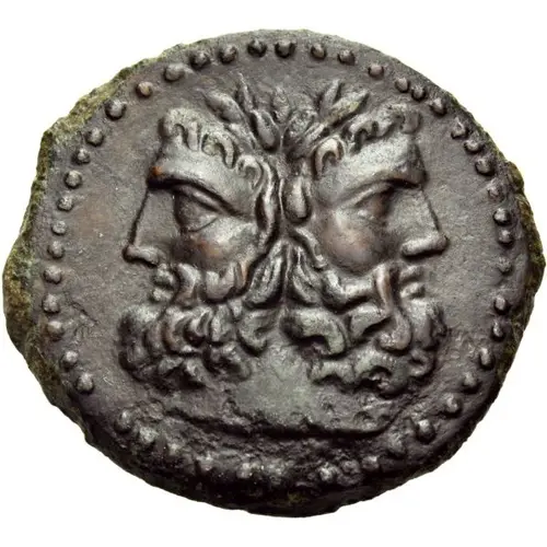 | Opis awersu | Laureate and bearded head of Janus; border of dots. |