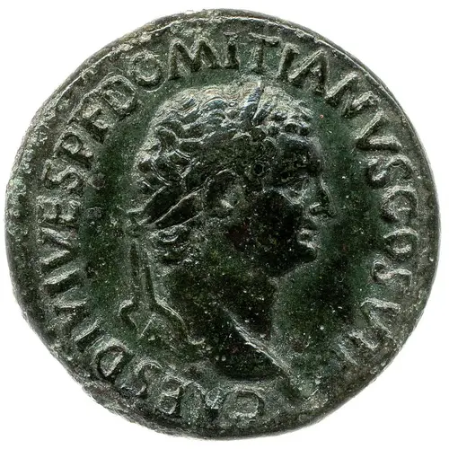 | نوشتههای روی سکه | CAES DIVI VESP F DOMITIANVS COS VII (Translation: Caesar, Divi Vespasiani Filius, Domitianus, Consul Septimum. Caesar, son of the divine Vespasianus, Domitian, consul for the seventh time.) |