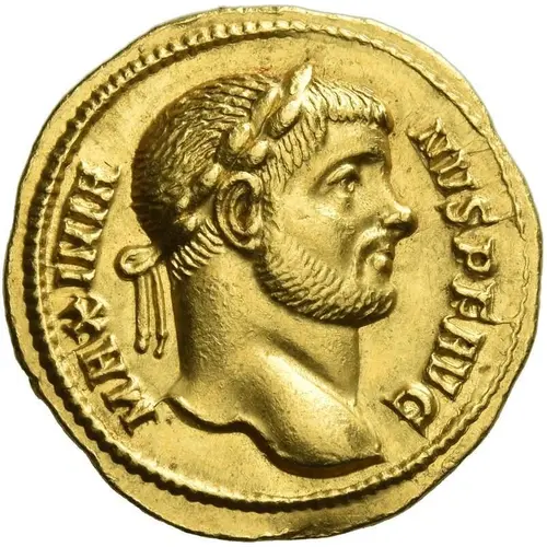 Descrição do anverso Head of Maximian, laureate, right.