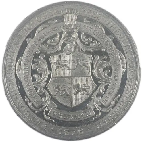 Chữ khắc mặt trước PATRON. H.M. QUEEN. VICTORIA PRES. THE. DUKE. OF. WESTMINSTER W. CORNWALLIS WEST CHAIRMAN WM. CHAFFERS MANAGER & HON. SEC. WREXHAM 1876