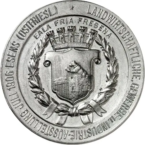 | 正面铭文 | LANDWIRTSCHAFTLICHE, GEWERBE- u. INDUSTRIE-AUSSTELLUNG JULI 1906 ESENS (OSTFRIESL.) ⋆ EALA FRIA FRESENA |