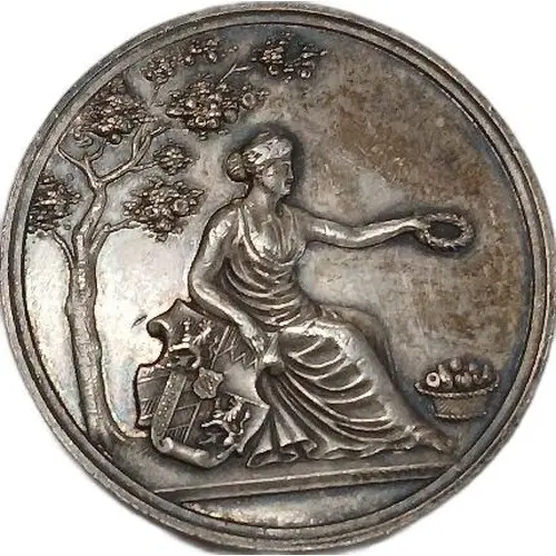 | Aversbeschreibung | Seated lady under a fruit tree resting right arm over shielded coat of arms, left arm outstretched holding wreath over fruit basket. |