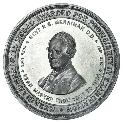 | Leyenda del anverso | MERRIMAN MEMORIAL MEDAL AWARDED FOR PROFICIENCY IN EXAMINATION REVD H.G. MERRIMAN D.D. BORN 1823 HEAD MASTER FROM 1859 TO 1874 DIED 1887 |