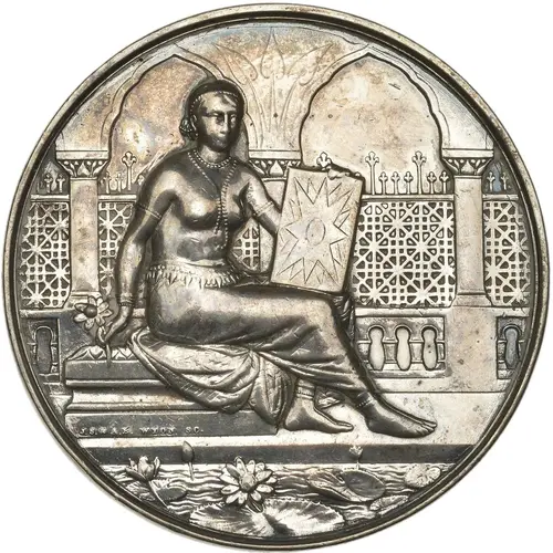| Obverse description | Semi-naked Indian female seated left, arches of building behind |