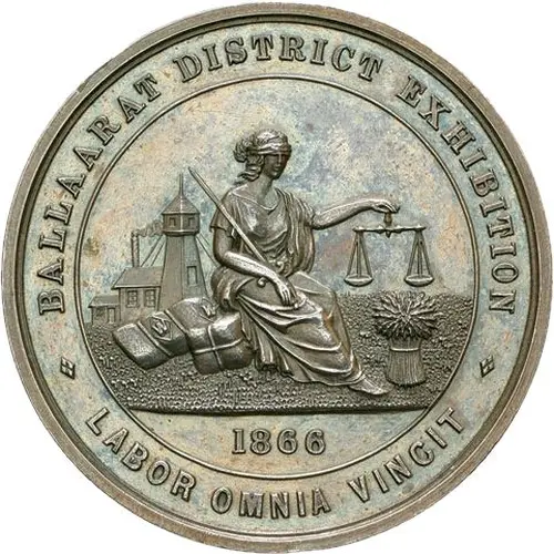 | Obverse lettering | ALLAARAT DISTRICT EXHIBITION 1866 LABOR OMNIA VINCIT |